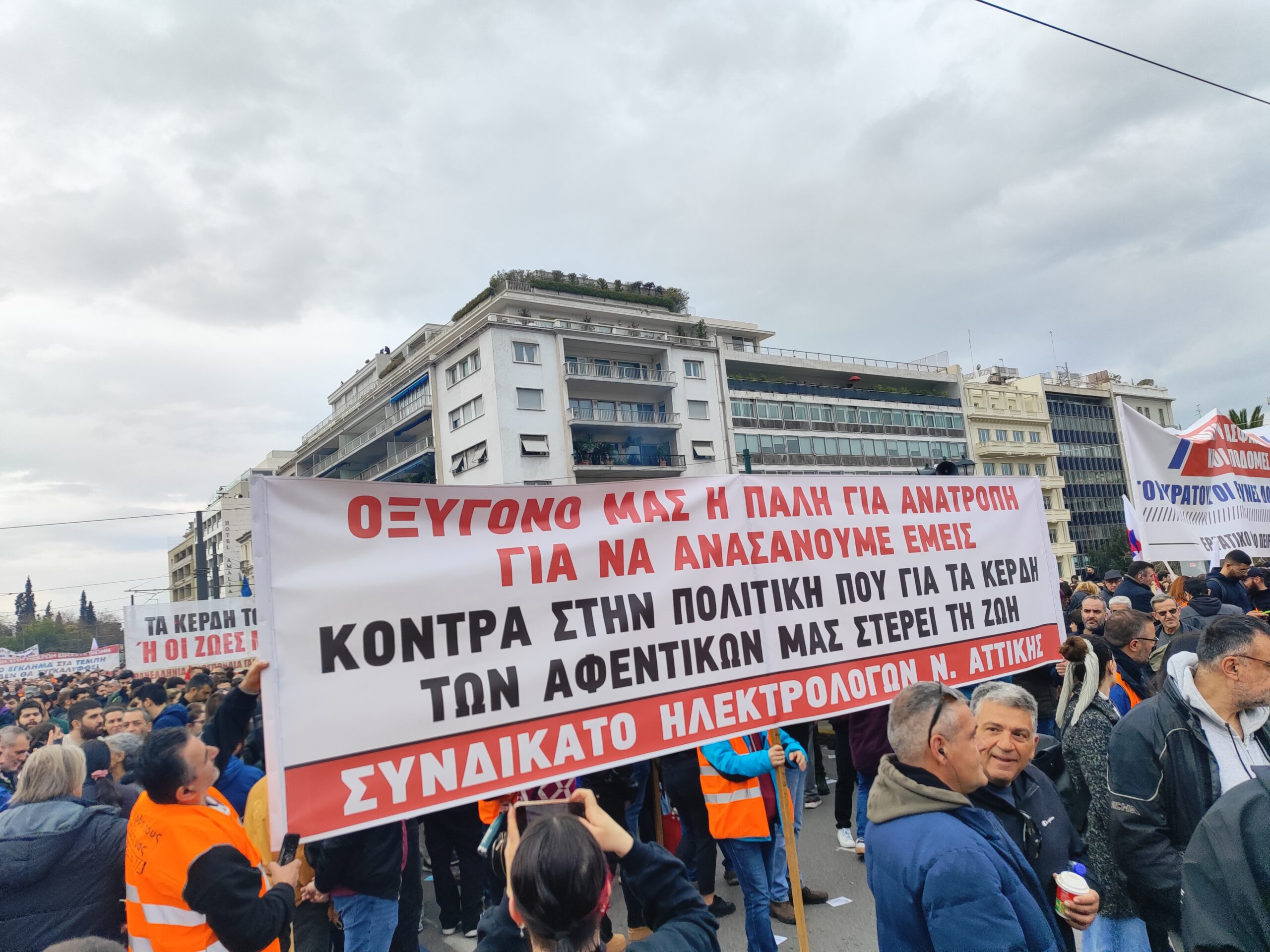 Χαιρετίζουμε τους χιλιάδες εργαζόμενους και τη νεολαία που ανταποκρίθηκαν το κάλεσμα των Εργατικών Κέντρων, των Ομοσπονδιών, των Συνδικάτων, των φοιτητικών συλλόγων, άλλων μαζικών φορέων και γέμισαν την πλατεία Συντάγματος στην Αθήνα.